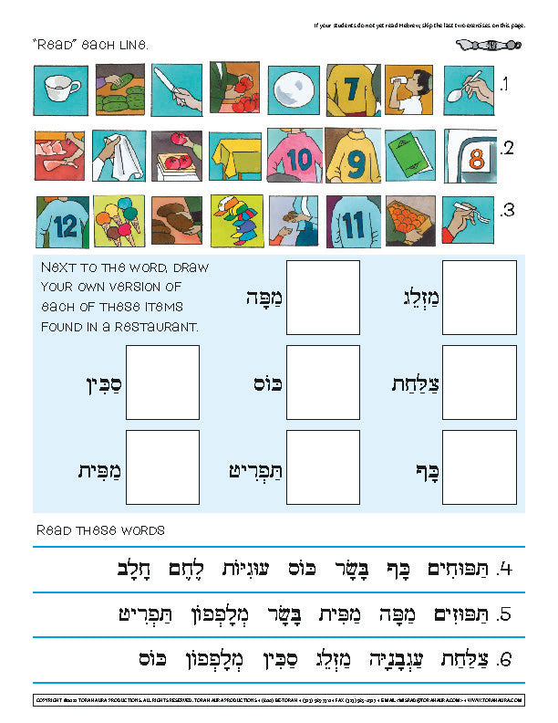 The Daber Ivrit: Eating in a Restaurant lesson introduces students to eight Hebrew words for things we find in a restaurant—fork, knife, spoon, cup, plate, napkin, tablecloth, and menu. The lesson includes the student material, the teacher guide, and a set of full-color vocabulary posters to print as you need.