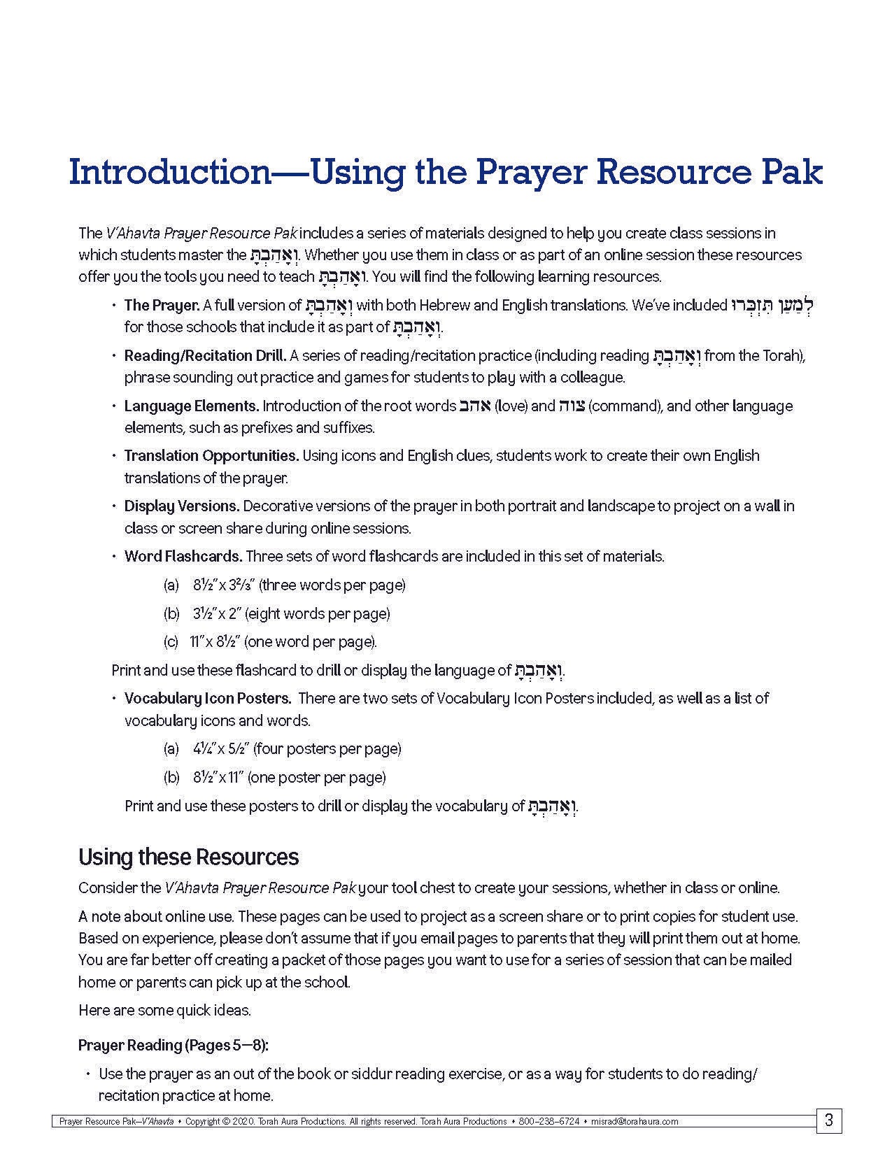 The V’Ahavta Prayer Resource Pak contains activities designed to help you create class sessions in which students master the V'Ahavta. Whether you use them in class or as part of an online session, these resources offer the tools you need to teach the V'Ahavta. You will find the following learning resources.