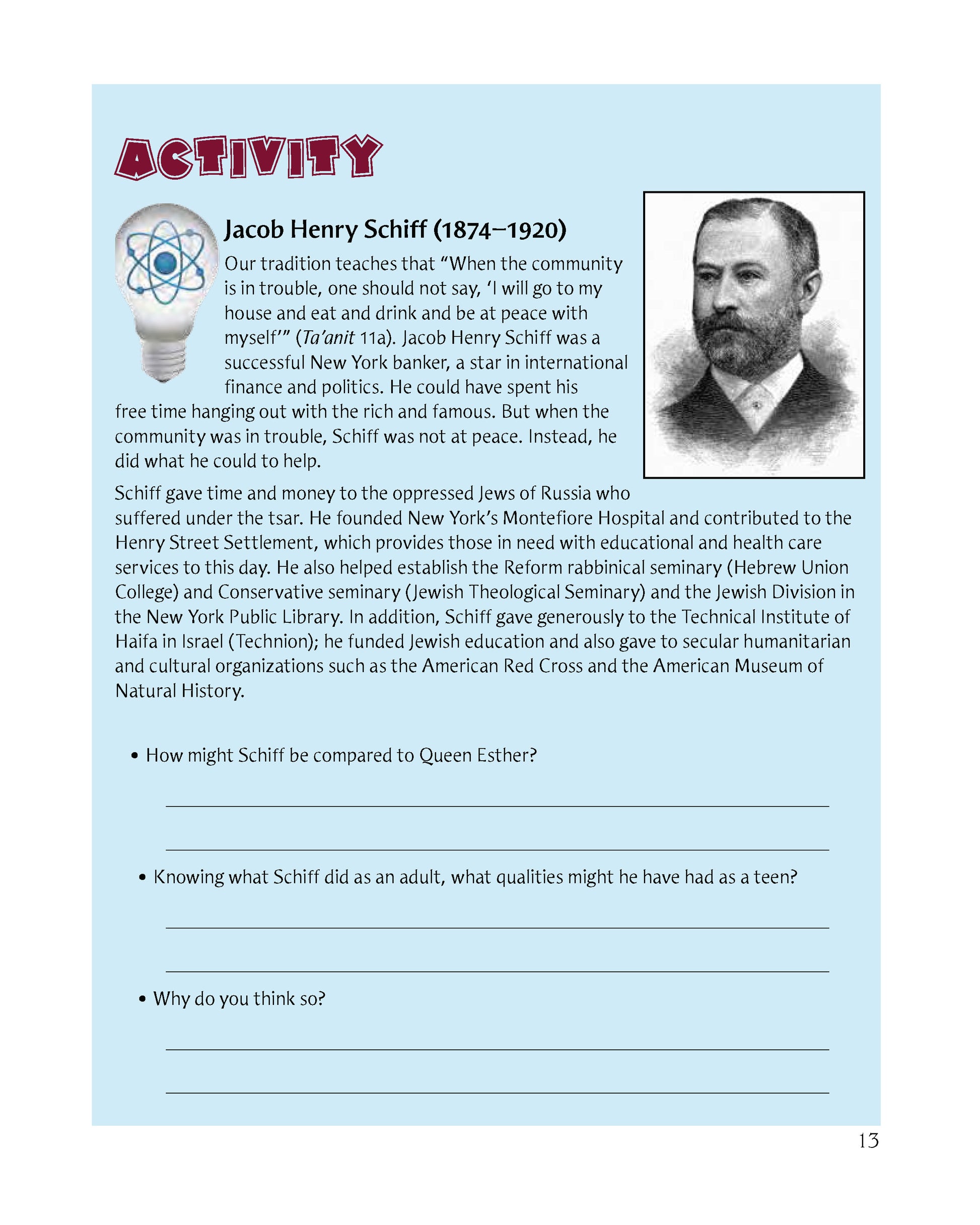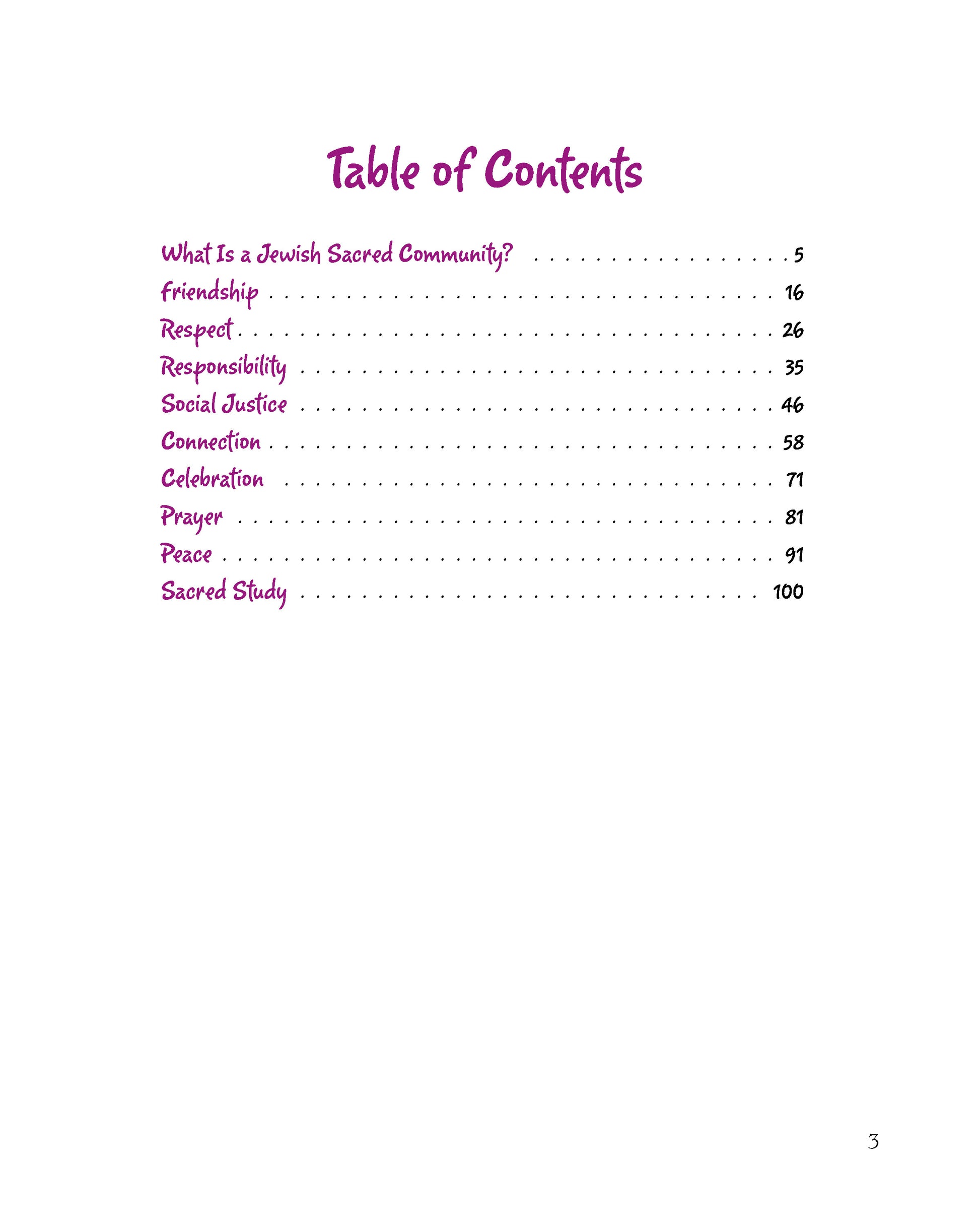 This book artfully helps each class build itself into a sacred community. Community is not only the subject of this book; it is also the result of the learning and experiences in this book. The book directs students to build relationships via these categories while covering topics like friendship, respect, responsibility, social justice, connection, celebration, prayer, peace, and Talmud Torah.