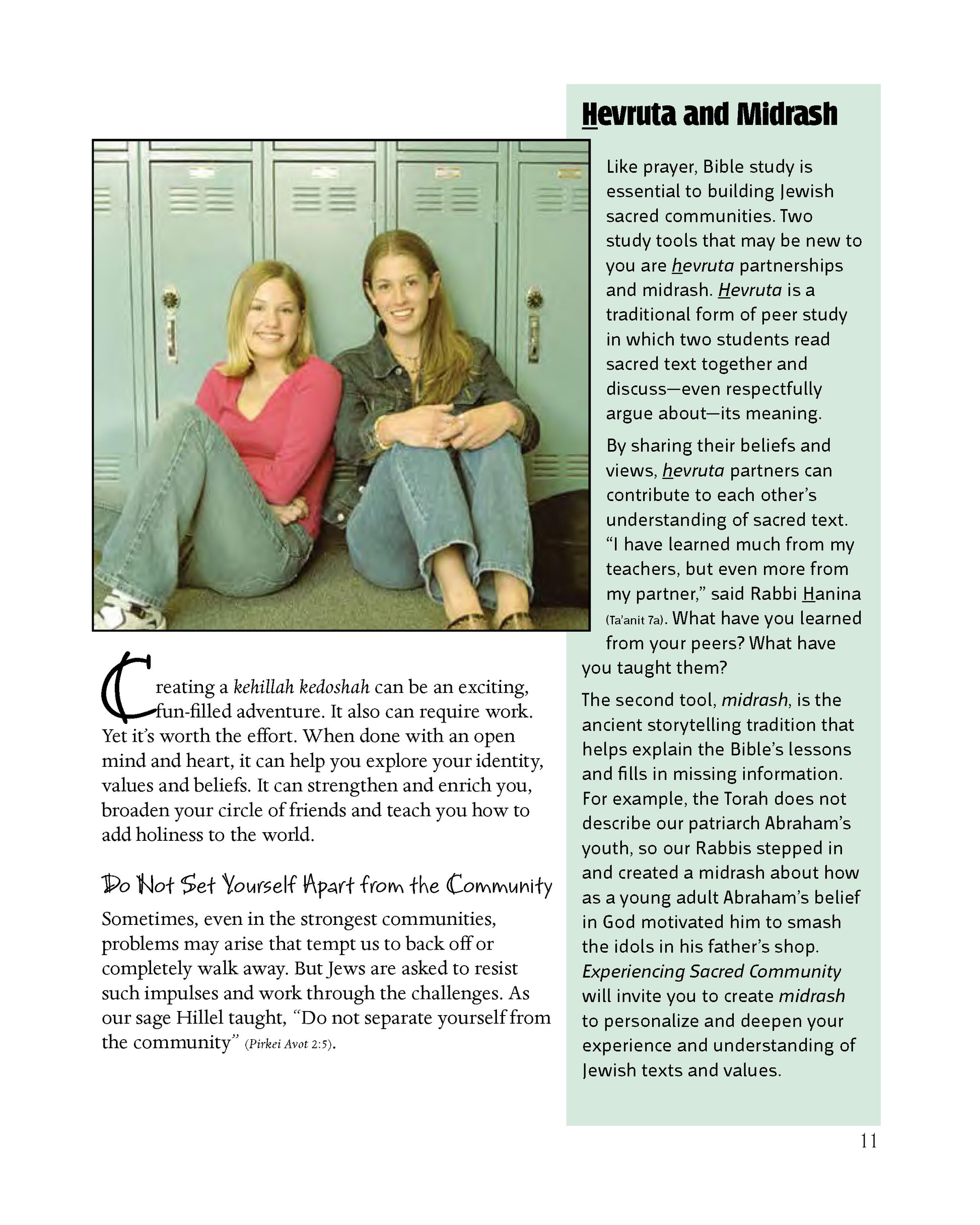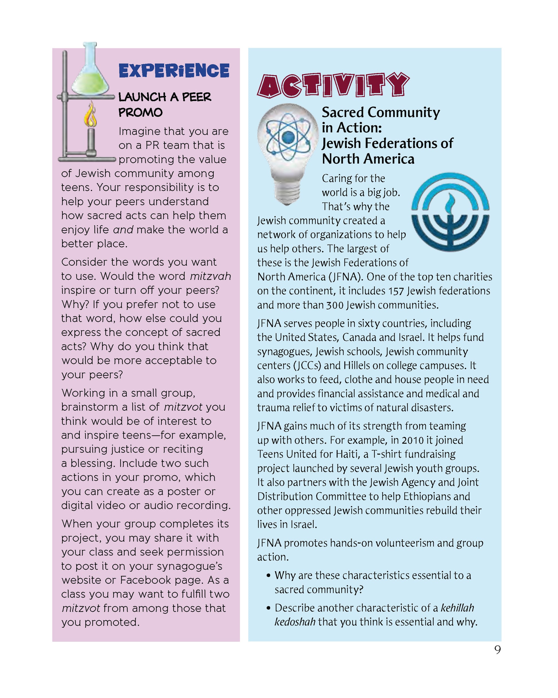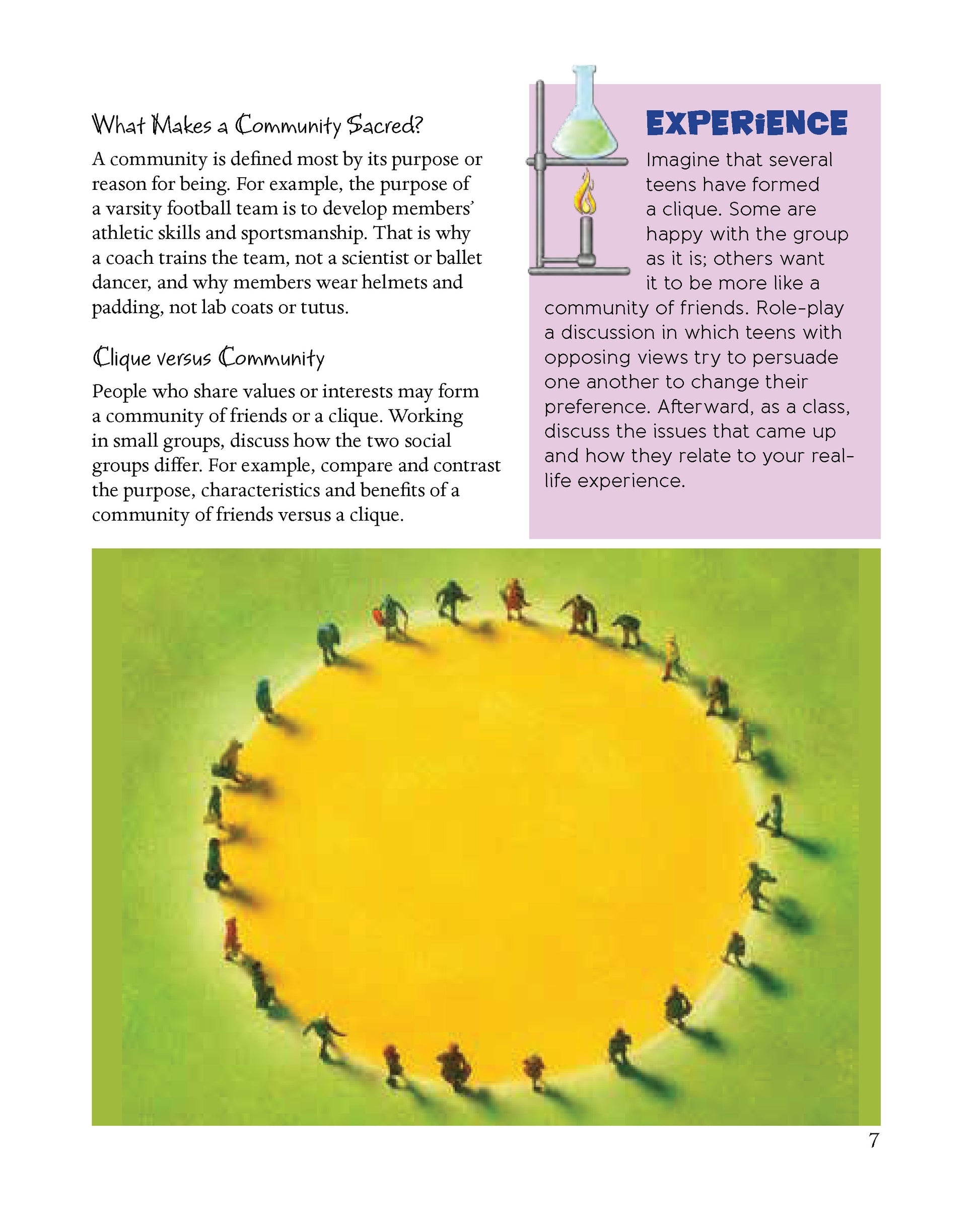 Grades: 7-9 Here is a subject you have always wanted to teach. Experiencing Sacred Community allows your students to discuss their classroom community and build and share it. If there is one experience (other than Israel), we want our students to have, it is part of a caring community.