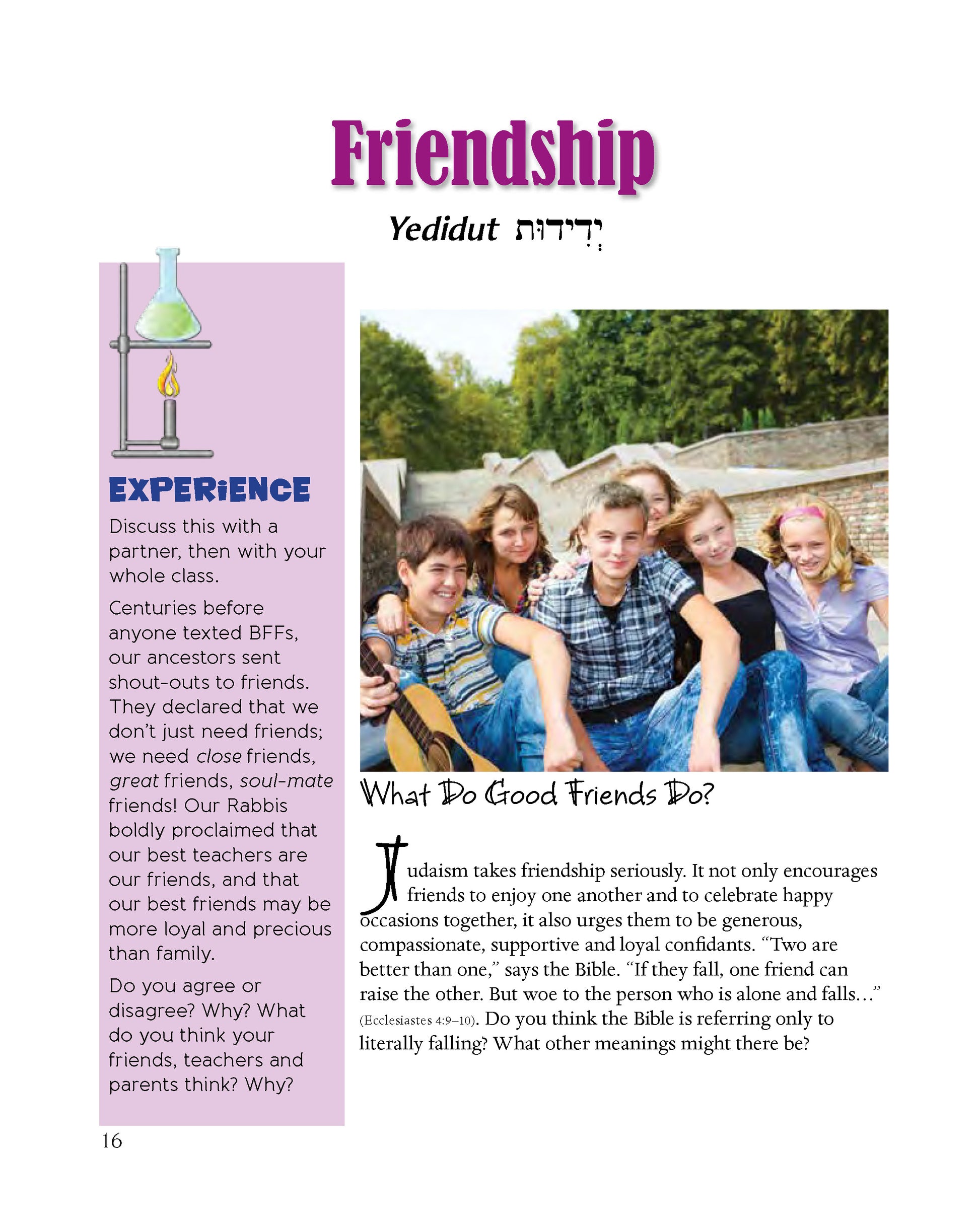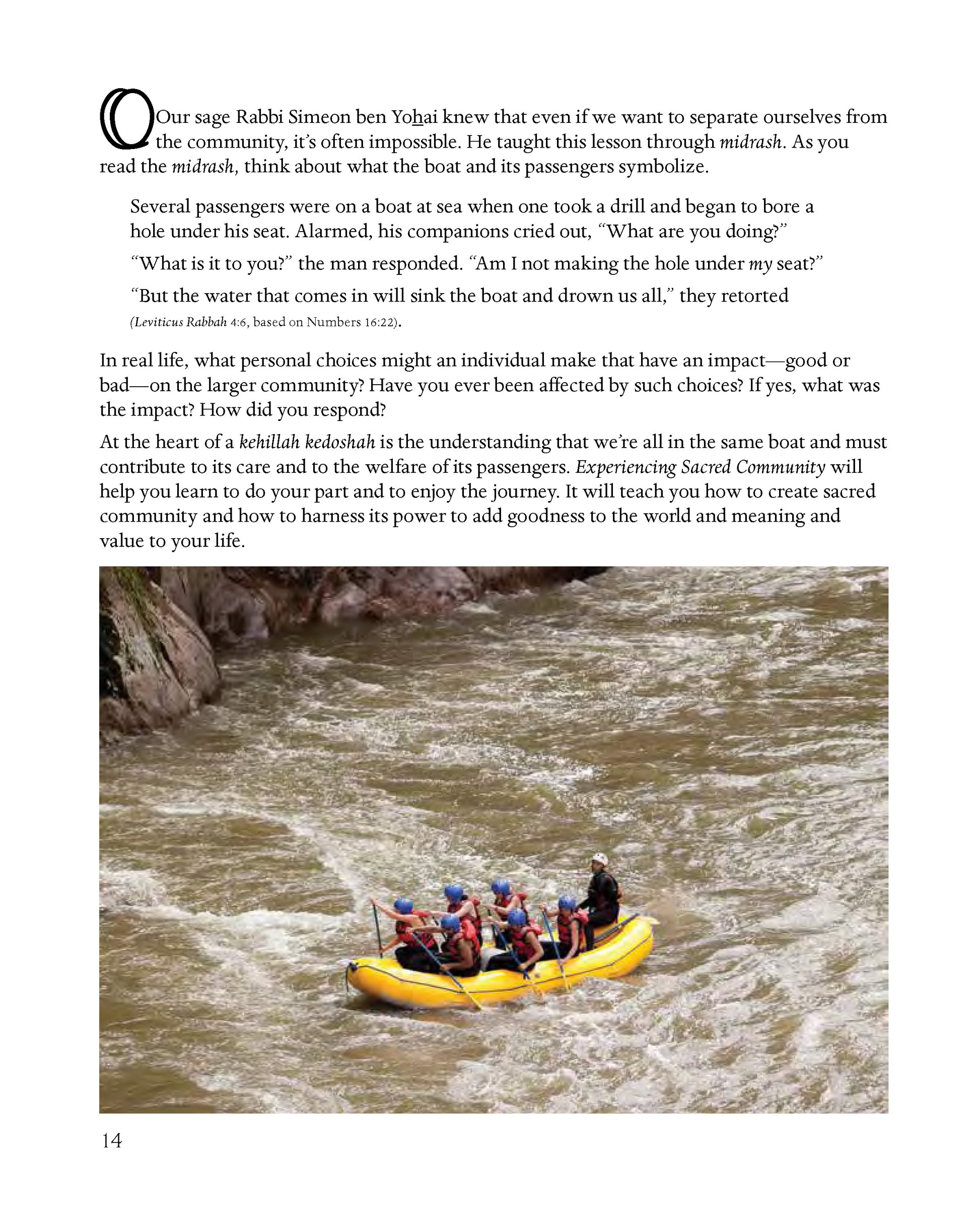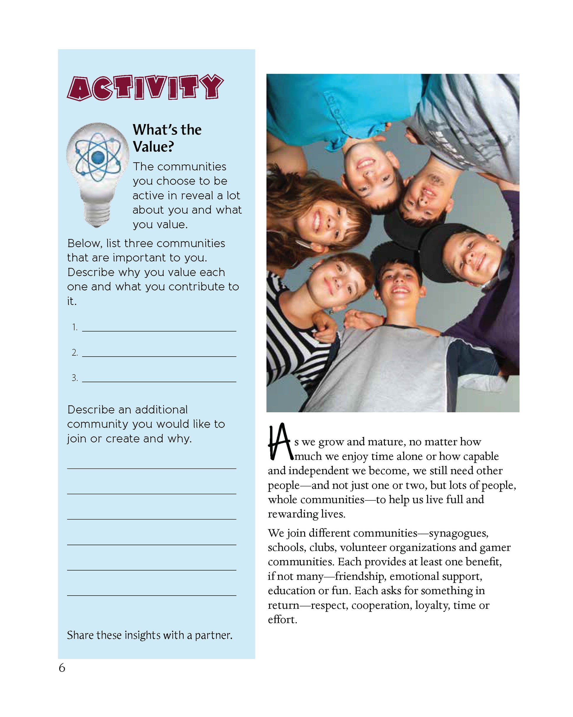 Grades: 7-9 Here is a subject you have always wanted to teach. Experiencing Sacred Community allows your students to discuss their classroom community and build and share it. If there is one experience (other than Israel), we want our students to have, it is part of a caring community.