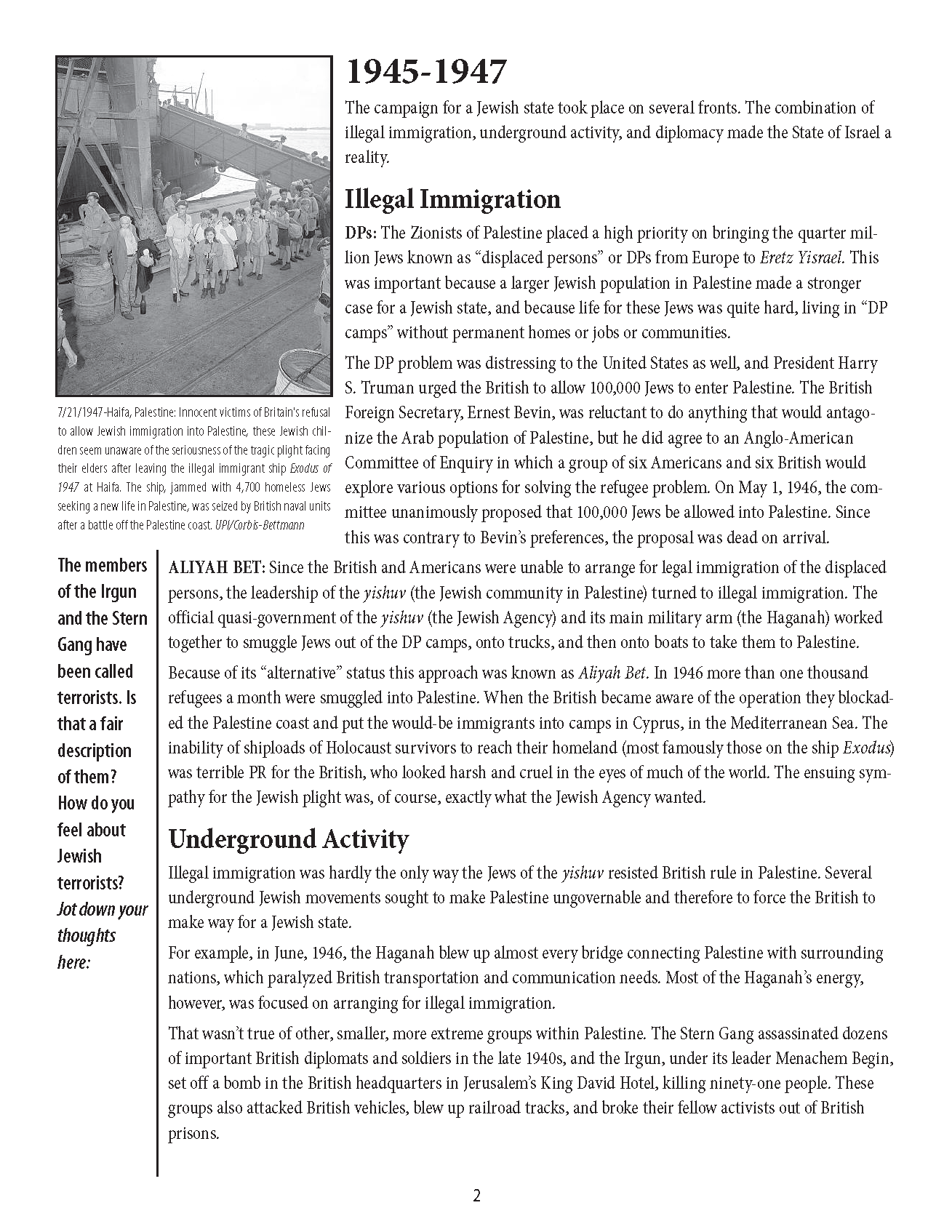 The History of Israel: Birth of Israel lesson offers students an opportunity to focus on the years right after World War II. Topics included are illegal immigration (Aliyah Bet), the Jewish underground armies, the diplomatic front (including the Partition Plan), and the British Mandate.