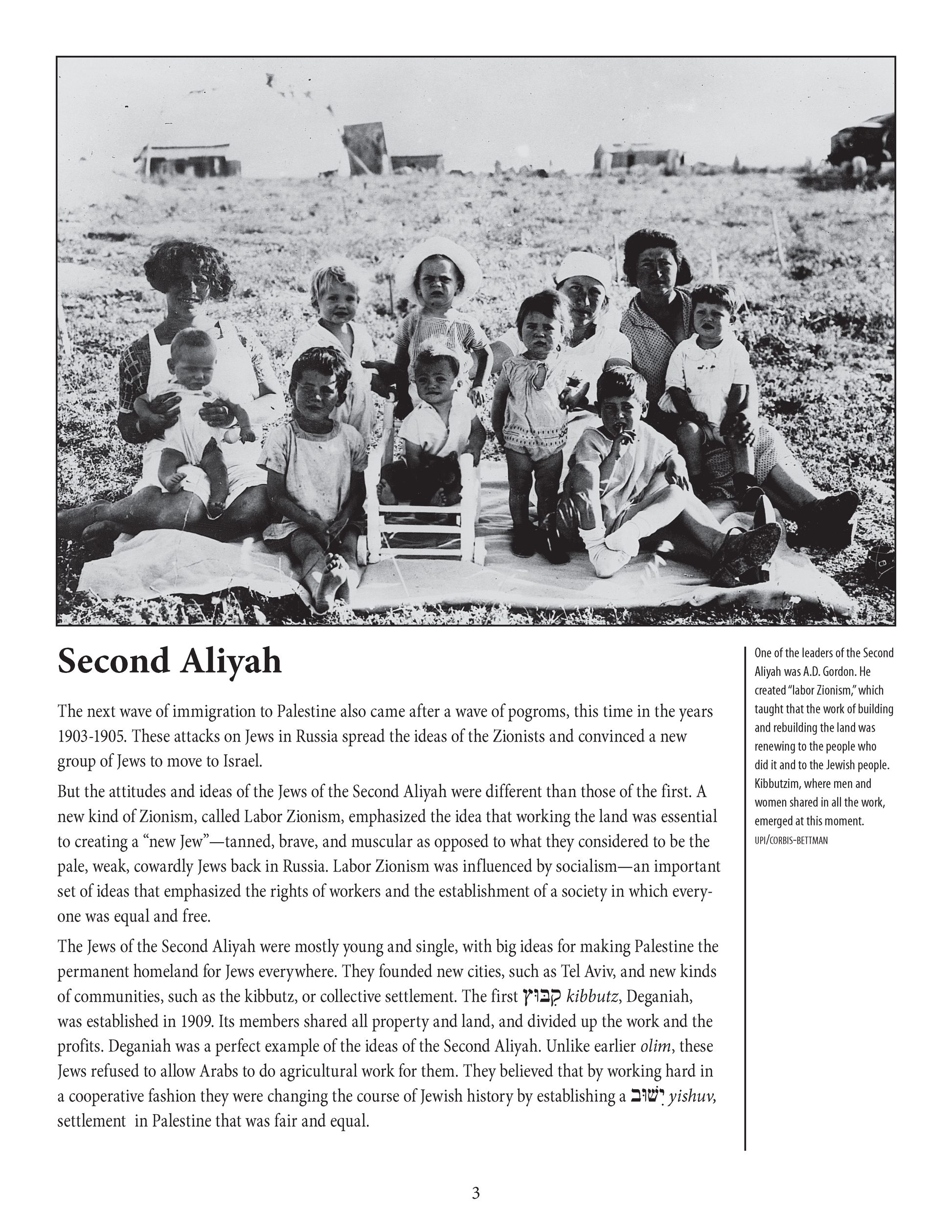 The History of Israel: Five Aliyot lesson offers students an opportunity to focus on the waves of immigration that came between 1880, when European immigration back to Palestine began, and the 1930s, when the last of the Jews who managed to escape Europe before World War II came. Each of these olim (immigrants) has his or her own story, but in each case, there were also common reasons pushing them to leave where they had been, and there were common beliefs pulling them toward the Land of Israel.