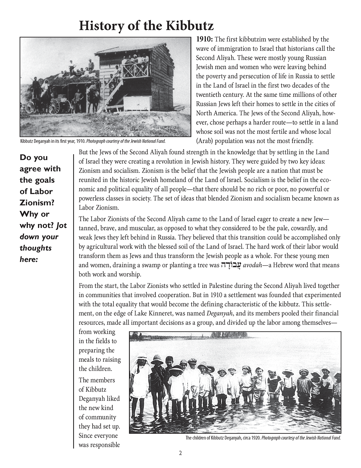 The History of Israel: Kibbutz lesson offers students an opportunity to focus on the history of the kibbutz and its creation by early settlers. It includes a simulated kibbutz meeting that struggles with the compromises that are facing the modern kibbutz movement and the changes that may be ending the viability of kibbutzim as a way of life. This lesson moves from the history of the kibbutz to its possible future.
