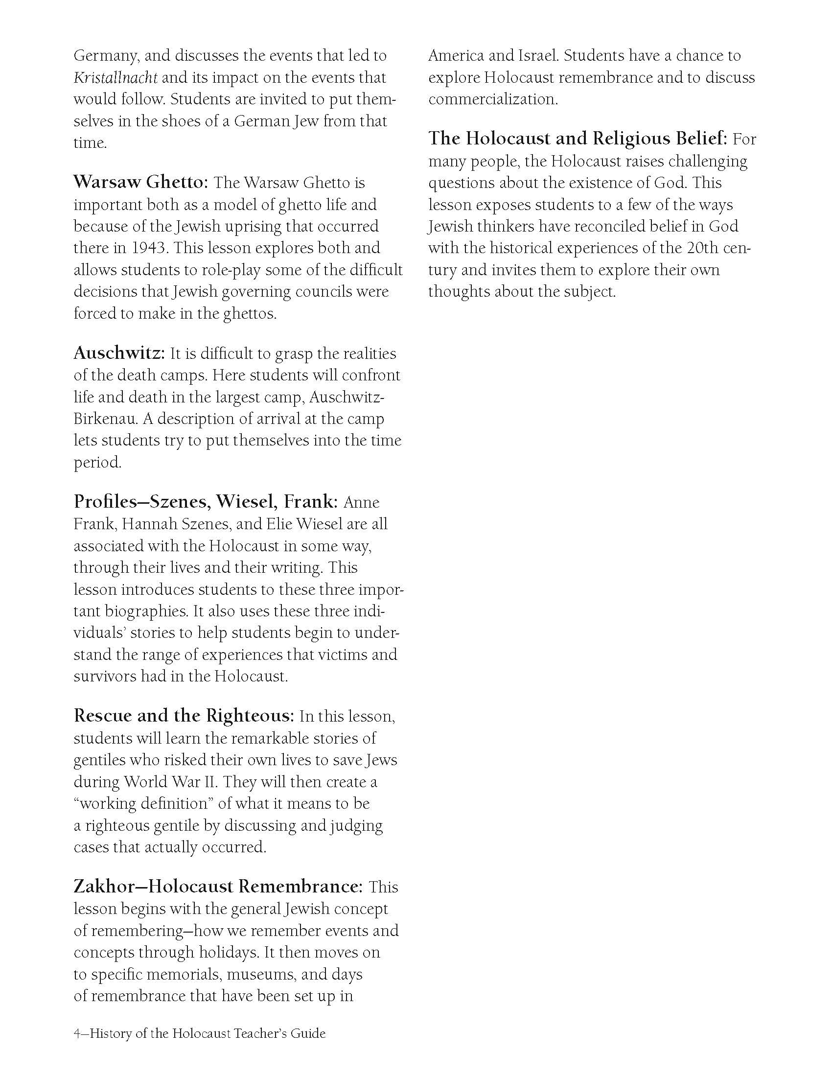 Grades: 6-Adult The History of the Holocaust lessons cover historical events, individual biographies, and concepts that provide an overall understanding of the Holocaust. The material is presented here as a series of individual lessons so that you, the teacher, can have the flexibility to decide how and when to use it with your class.