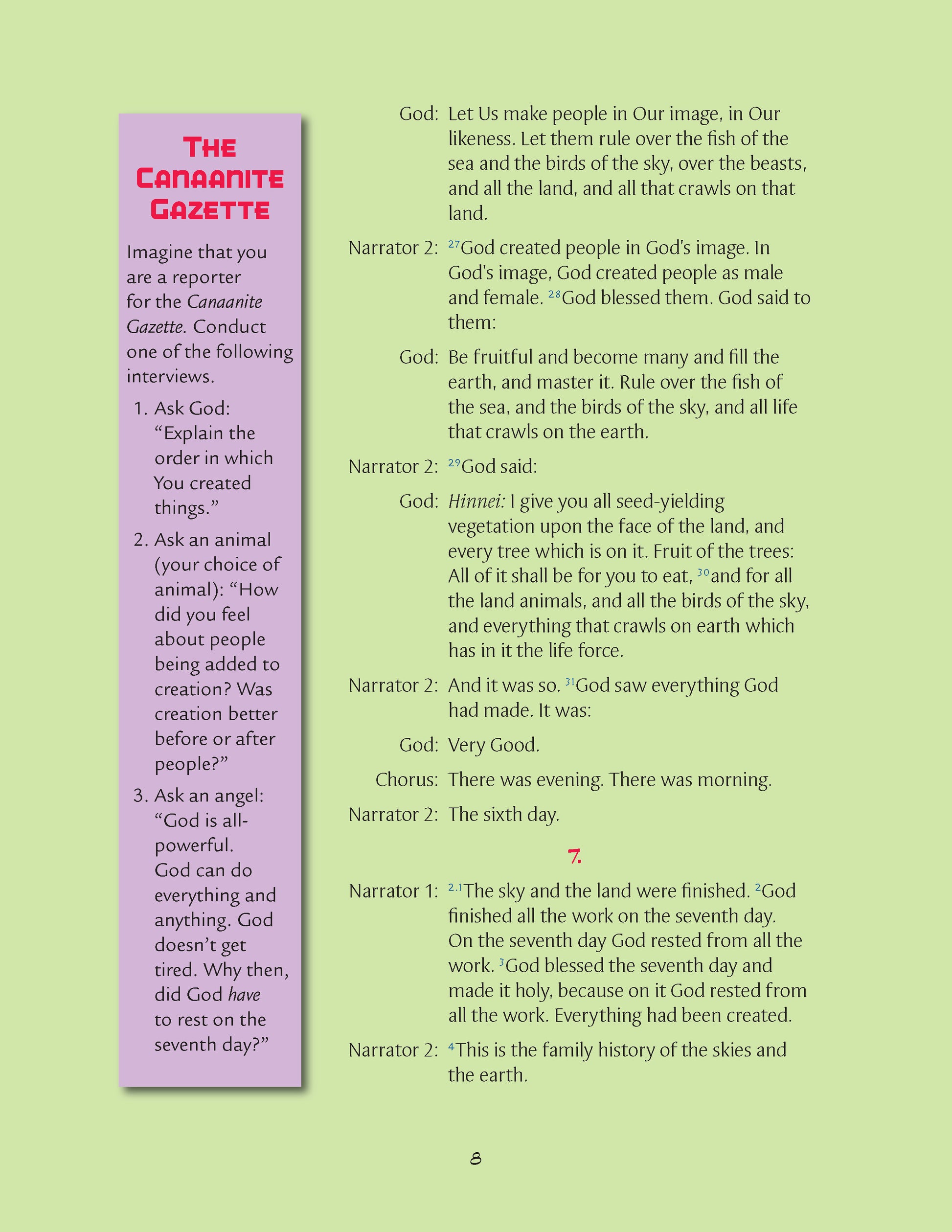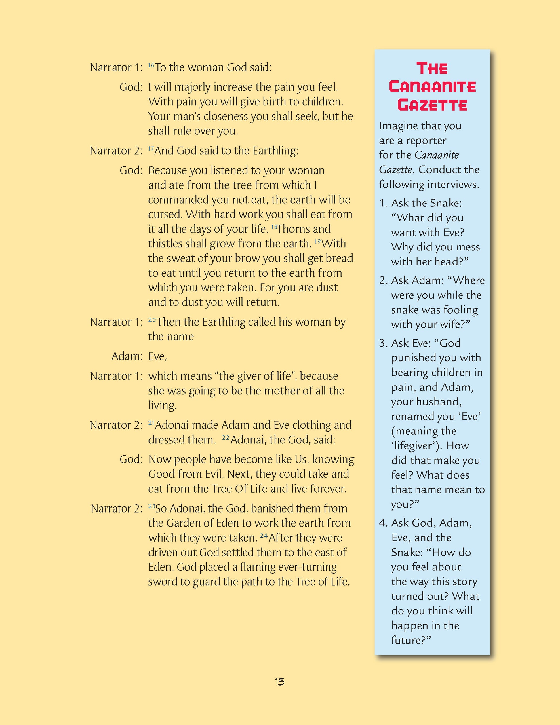 Next, the class looks at “The Canaanite Gazette.” Working in pairs, students are asked to work on one of the four interview questions. Here is an example of one, “Ask God, “What scared you? What would have been so bad if the people had built a tower that reached to the heavens? You don’t live in heaven, do you?” Students then present their interviews as performances to the class.