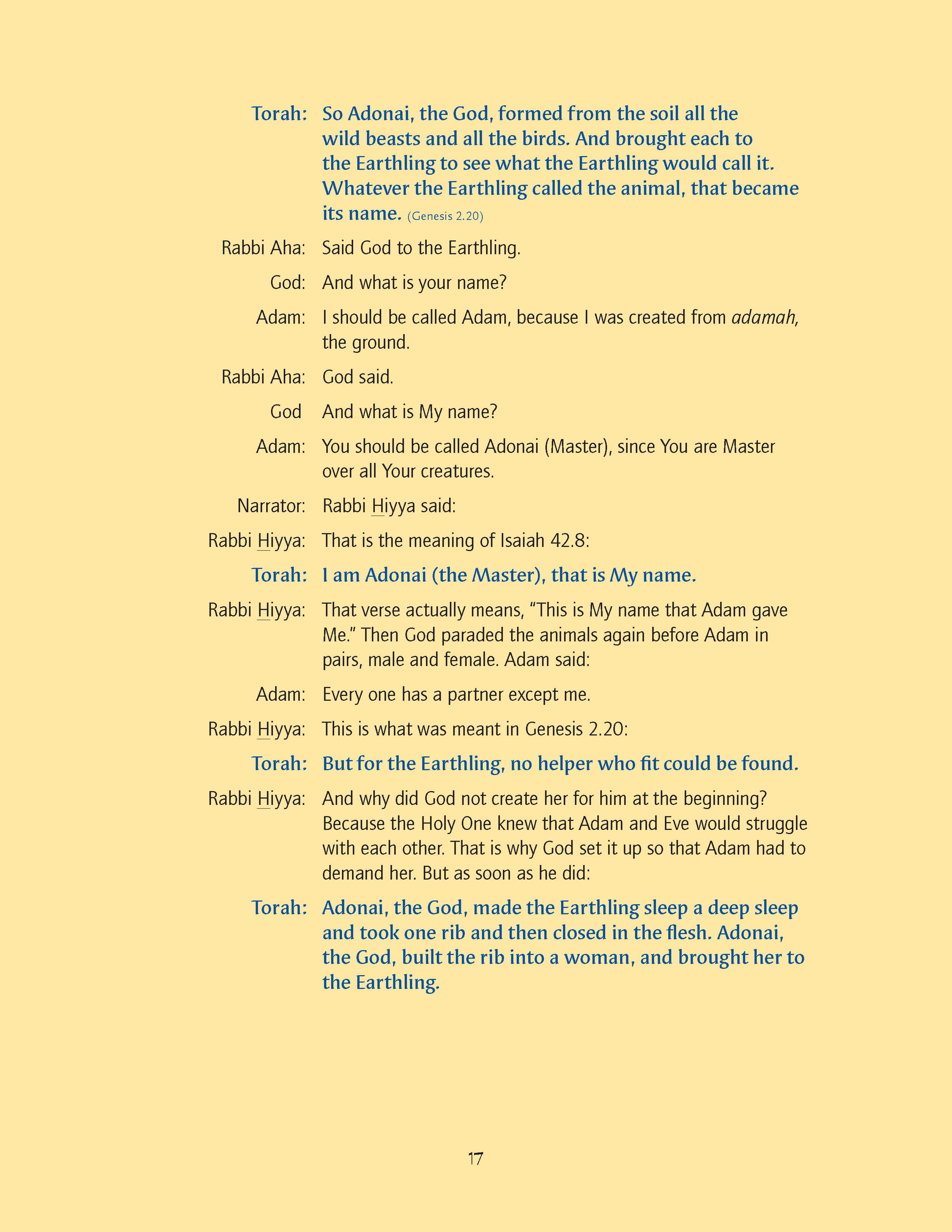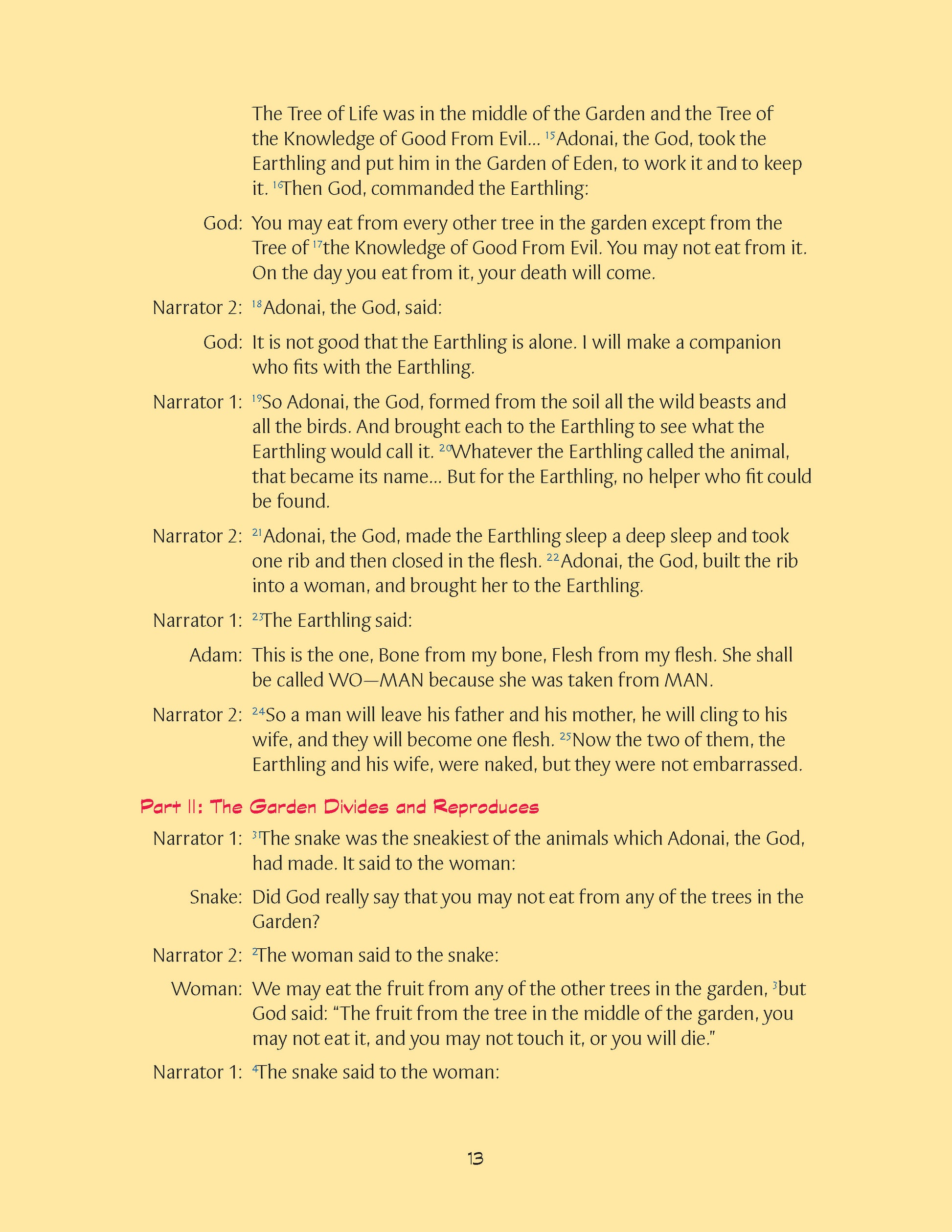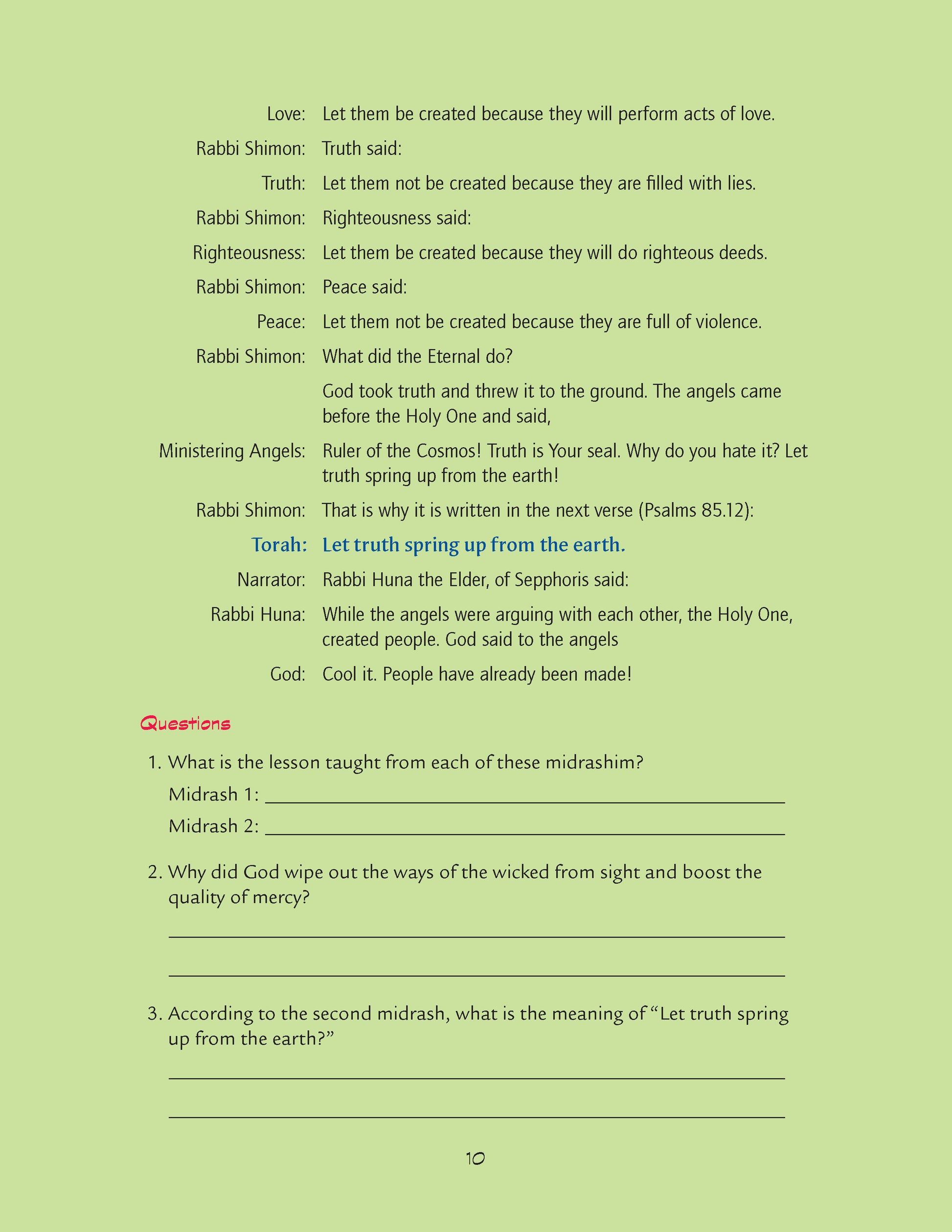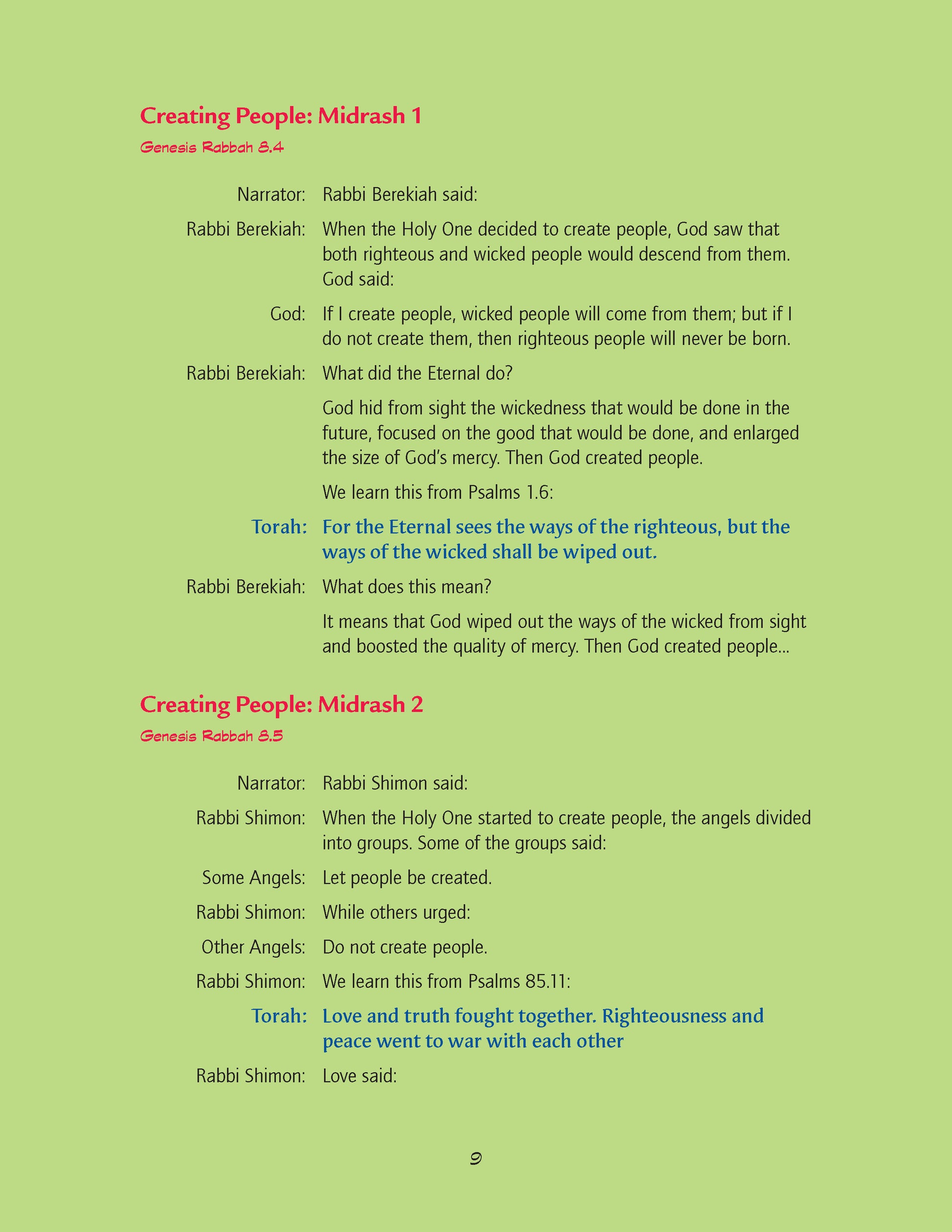 Imagine this lesson: The class opens their Make a Midrash Out of Me to page 35. The teacher assigns the parts of God and Narrator and asks the rest of the class to read the part of “People.” The class performs the biblical text from a specially prepared translation that reads like a script.