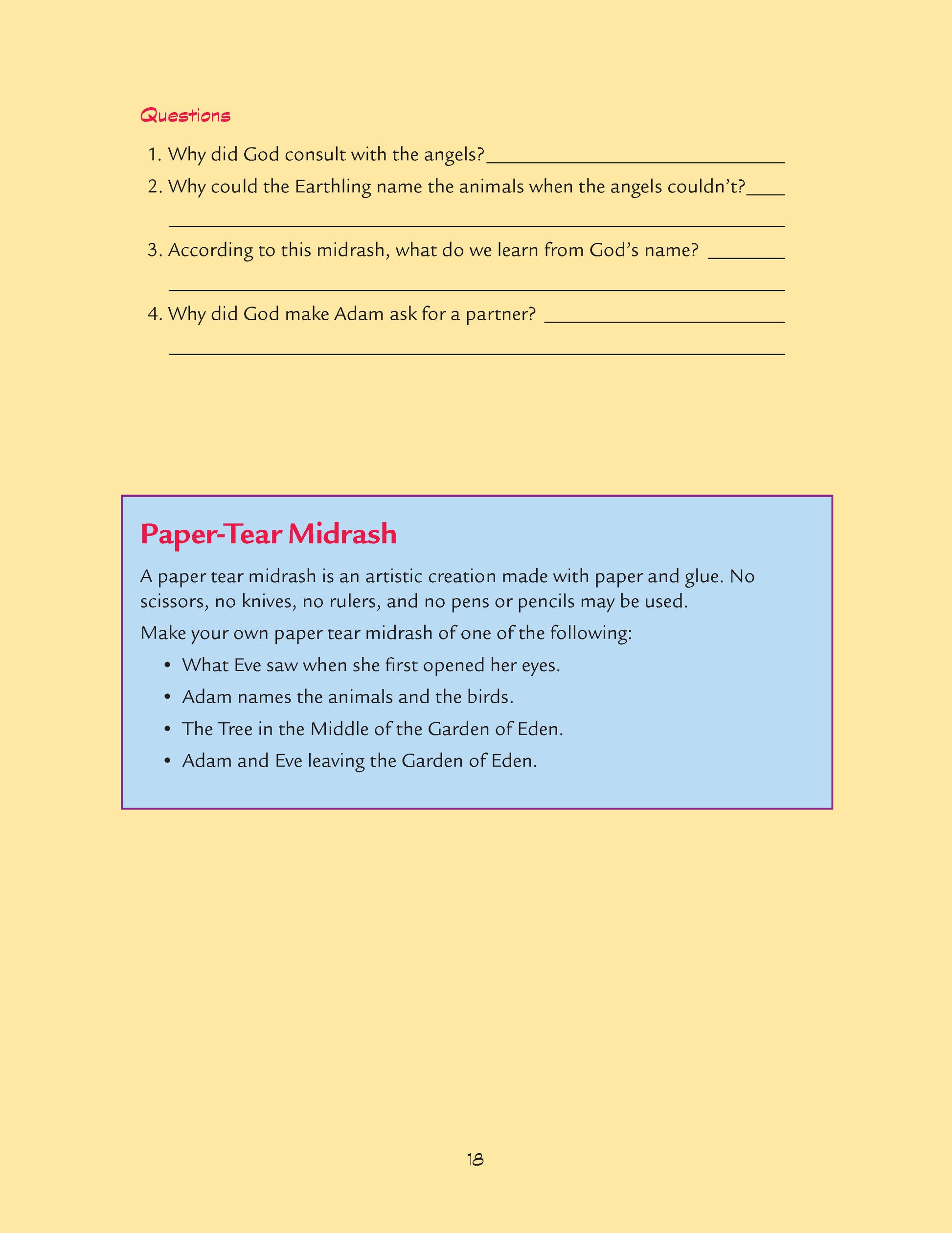 The lesson moves on to look at a real midrash. In this case, it is the story of Adam and Eve’s coats that Nimrod used to convince people to build the tower. Students again take parts and read the midrash which is also translated in script form. Then, working in pairs, students answer a series of questions that help them to analyze the midrash. This is followed by class discussion. The last part of the class is a creative process. Students create their own dialogues between two workers on the tower.