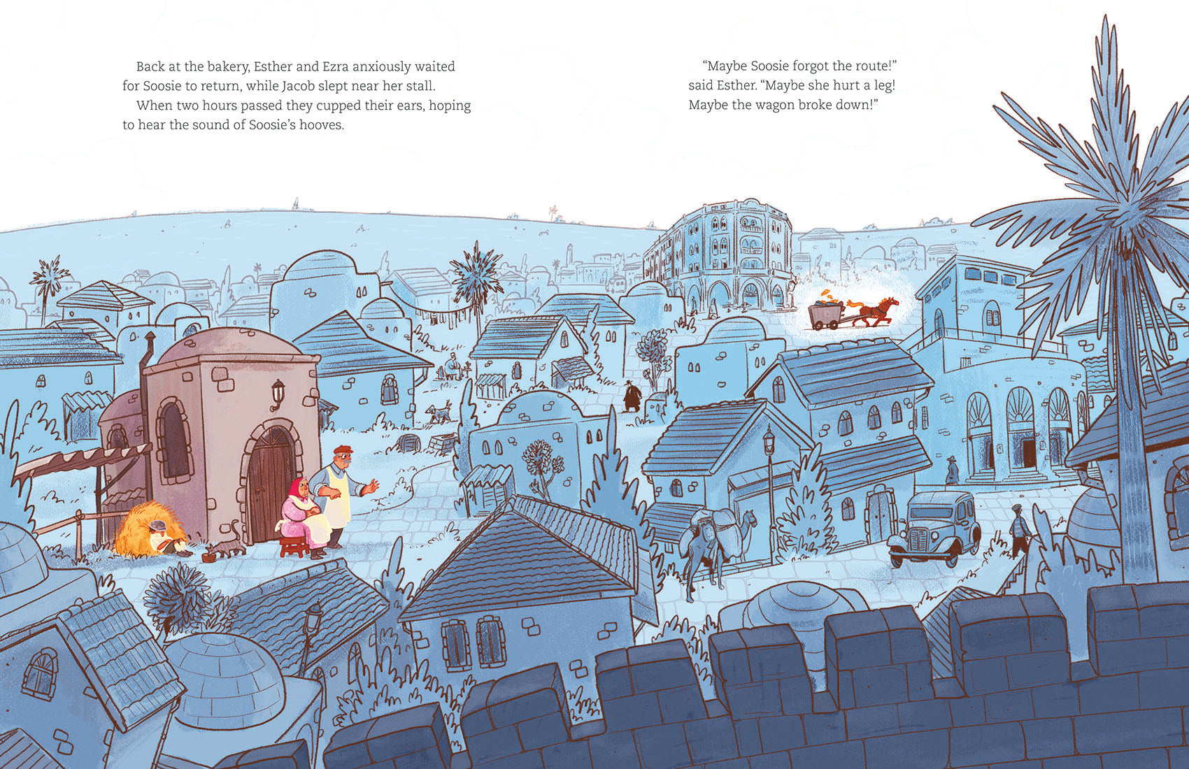 In the early 20th century, the city of Jerusalem is still a small town. Bakery owners Esther and Ezra bake the challahs before dawn on Friday mornings to be ready by daylight for delivery to Jewish families. Jacob, their reliable delivery boy, loads the cart, hitches up their horse, clicks his tongue to her, and off they go. Jacob and Soosie make several stops along the road for people waiting to select their loaves and place payment in a little tin bank affixed to the side of the cart, exchanging greetings of “Shabbat Shalom” as they go. One memorable Friday, Jacob is very sick, but he and the bakers are confident that Soosie can do the job on her own. After all, she knows the routine very well. They put a note under the tin bank so their customers will understand the unusual change. It works perfectly, and the exhausted Soosie arrives home with a full bank and an empty stomach. She is given the trio’s gratitude, a meal, and a well-earned rest. Halberstadt’s cartoon illustrations are filled with energy and emotion, vividly depicting characters and important objects in bright colors, with some backgrounds in gray, and just enough detail to set the scene. Diverse townspeople are seen with many different skin tones and a wide variety of dress indicating the scattered places from which they migrated to Palestine/Israel. A detailed author’s note explains the tale’s origins, a bit of Jerusalem’s history, and the rituals of Shabbat.